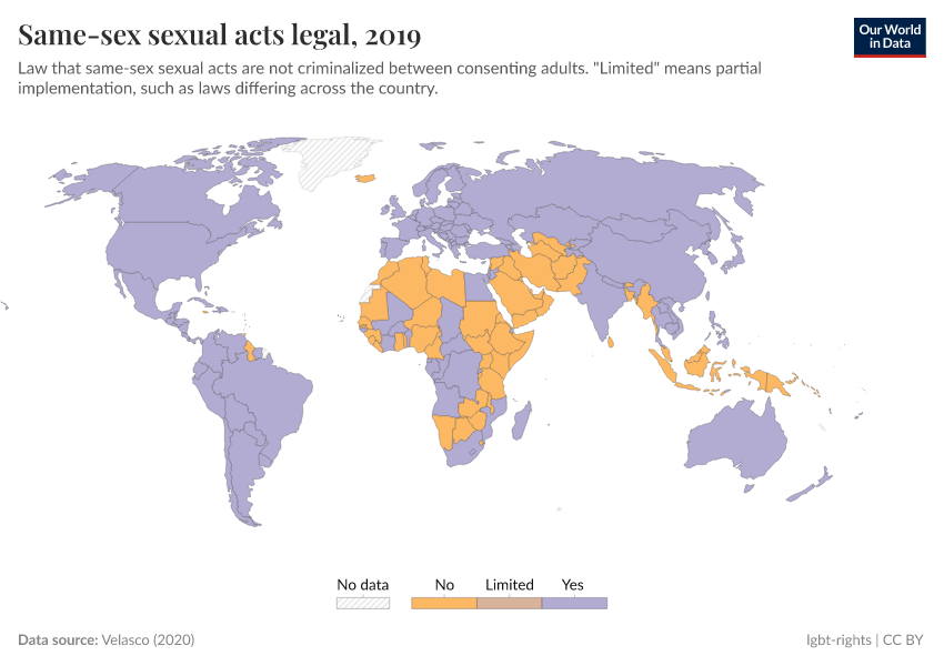 “Data Page: Same-sex sexual acts legal”, part of the following publication: Bastian Herre and Pablo Arriagada (2023) - “LGBT+ Rights”. Data adapted from Velasco. Retrieved from https://data-auxiliary-trade.owid.pages.dev/grapher/same-sex-sexual-acts-legal [online resource]How to cite this data