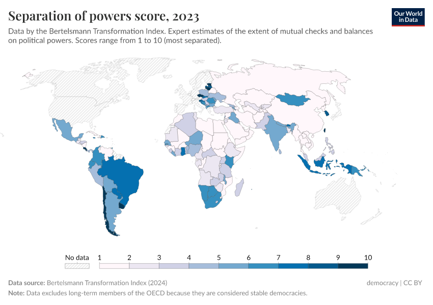“Data Page: Separation of powers score”, part of the following publication: Bastian Herre, Lucas Rodés-Guirao, and Esteban Ortiz-Ospina (2013) - “Democracy”. Data adapted from Bertelsmann Transformation Index. Retrieved from https://data-auxiliary-trade.owid.pages.dev/grapher/separation-of-powers-score-bti [online resource]How to cite this data
