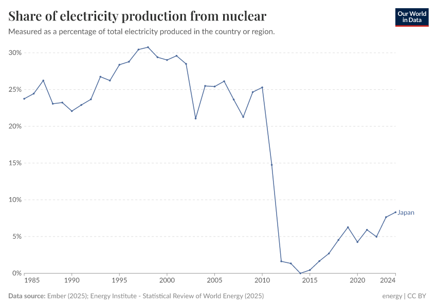 Ember (2025); Energy Institute - Statistical Review of World Energy (2025) – with major processing by Our World in Data. “Share of electricity generated by nuclear power” [dataset]. Ember, “Yearly Electricity Data Europe”; Ember, “Yearly Electricity Data”; Energy Institute, “Statistical Review of World Energy” [original data]. Retrieved September 5, 2025 from https://data-auxiliary-trade.owid.pages.dev/grapher/share-electricity-nuclear