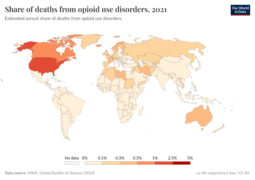 IHME, Global Burden of Disease (2024) – with minor processing by Our World in Data. “Share of deaths from opioid use disorders” [dataset]. IHME, Global Burden of Disease, “Global Burden of Disease - Deaths and DALYs” [original data]. Retrieved September 5, 2025 from https://data-auxiliary-trade.owid.pages.dev/grapher/share-of-deaths-from-opioid-overdoses