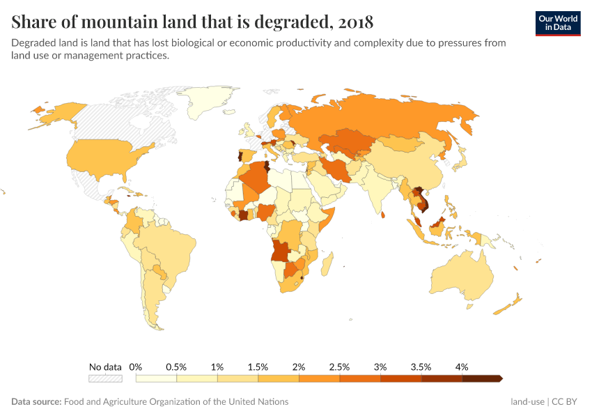 “Data Page: Share of mountain land that is degraded”. Our World in Data (2025). Data adapted from Food and Agriculture Organization of the United Nations. Retrieved from https://data-auxiliary-trade.owid.pages.dev/grapher/share-of-mountain-land-that-is-degraded [online resource]How to cite this data