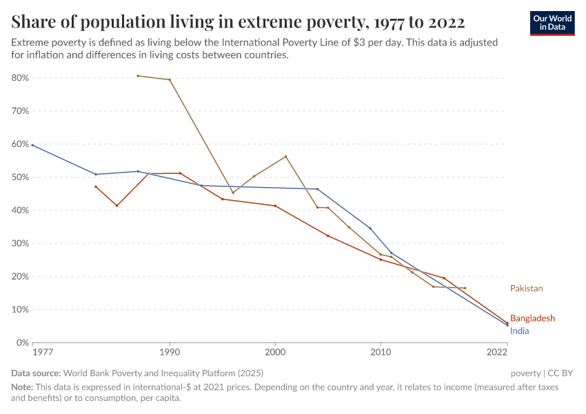 World Bank Poverty and Inequality Platform (2025) – with major processing by Our World in Data. “Share of population living in extreme poverty – World Bank” [dataset]. World Bank Poverty and Inequality Platform, “World Bank Poverty and Inequality Platform (PIP) 20250401_2021, 20250401_2017” [original data]. Retrieved September 5, 2025 from https://data-auxiliary-trade.owid.pages.dev/grapher/share-of-population-in-extreme-poverty