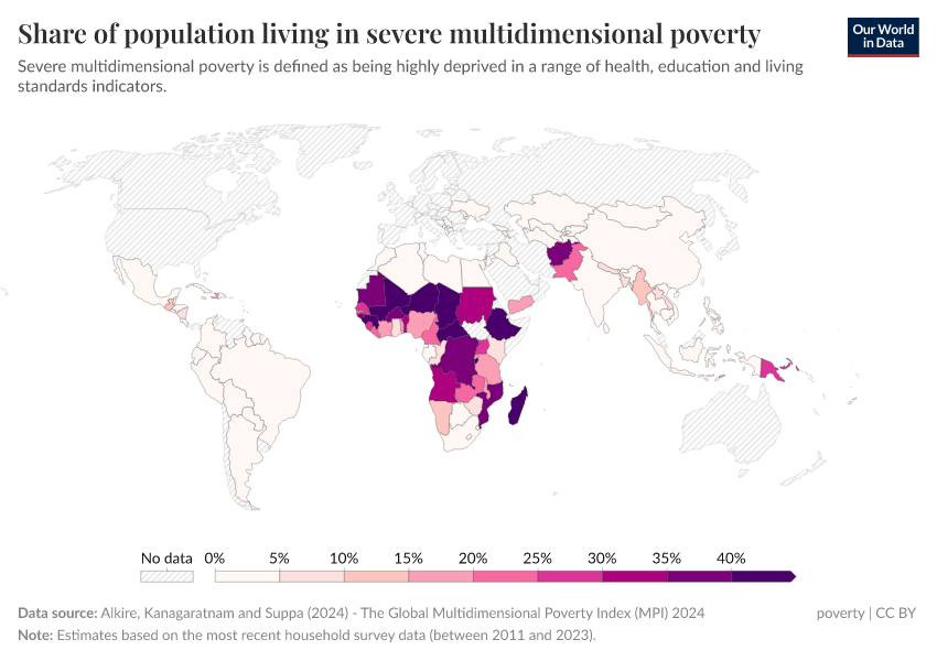“Data Page: Share of population living in severe multidimensional poverty”, part of the following publication: Joe Hasell, Bertha Rohenkohl, Pablo Arriagada, Esteban Ortiz-Ospina, and Max Roser (2022) - “Poverty”. Data adapted from Alkire, Kanagaratnam and Suppa. Retrieved from https://data-auxiliary-trade.owid.pages.dev/grapher/share-of-population-in-severe-multidimensional-poverty [online resource]How to cite this data