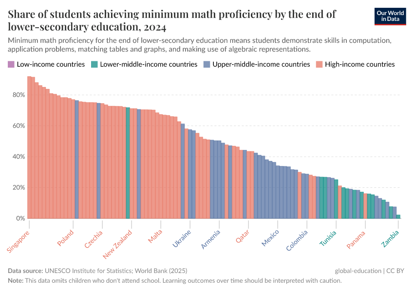 UNESCO Institute for Statistics – processed by Our World in Data. “Share of students achieving minimum math proficiency by the end of lower-secondary education” [dataset]. UNESCO Institute for Statistics, “Data from multiple sources” [original data]. Retrieved September 5, 2025 from https://data-auxiliary-trade.owid.pages.dev/grapher/share-of-students-at-end-of-lower-secondary-education-achieving-minimum-math-proficiency