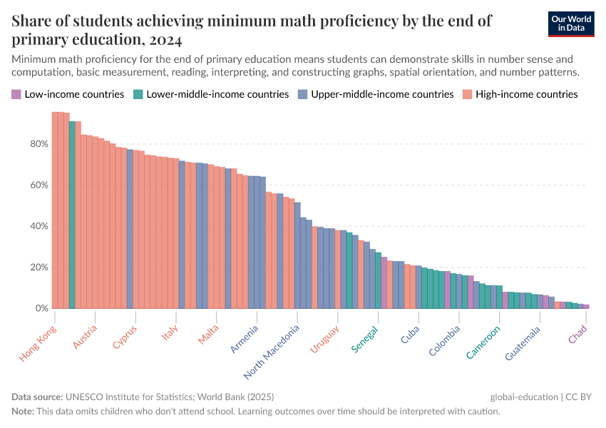 UNESCO Institute for Statistics – processed by Our World in Data. “Share of students achieving minimum math proficiency by the end of primary education” [dataset]. UNESCO Institute for Statistics, “Data from multiple sources” [original data]. Retrieved September 5, 2025 from https://data-auxiliary-trade.owid.pages.dev/grapher/share-of-students-at-end-of-primary-education-achieving-minimum-math-proficiency