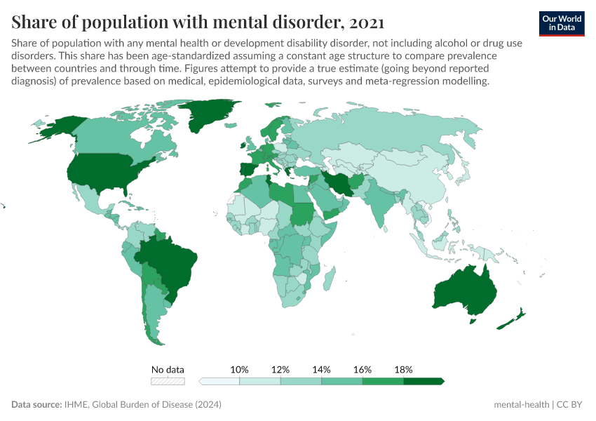 IHME, Global Burden of Disease (2024) – with major processing by Our World in Data. “Share of population with mental disorder” [dataset]. IHME, Global Burden of Disease, “Global Burden of Disease - Mental Health Prevalence” [original data]. Retrieved September 5, 2025 from https://data-auxiliary-trade.owid.pages.dev/grapher/share-with-mental-health-or-development-disorder