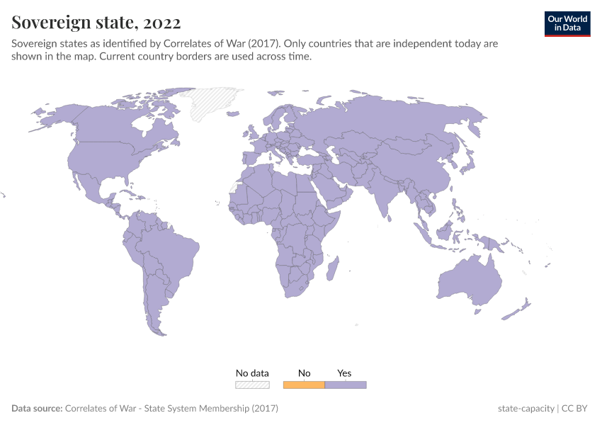 “Data Page: Sovereign state”, part of the following publication: Bastian Herre and Pablo Arriagada (2023) - “State Capacity”. Data adapted from Correlates of War. Retrieved from https://data-auxiliary-trade.owid.pages.dev/grapher/sovereign-state-cow [online resource]How to cite this data