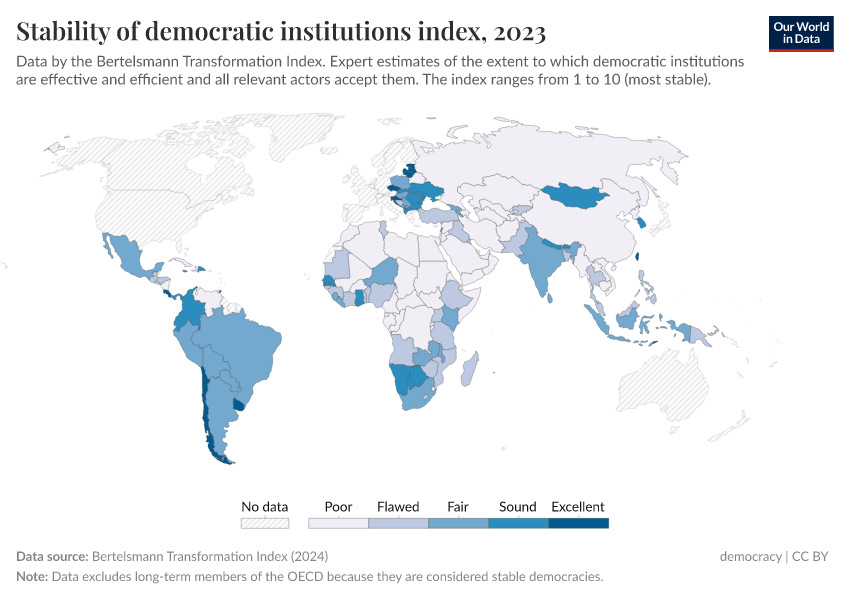 Bertelsmann Transformation Index (2024) – processed by Our World in Data. “Stability of democratic institutions index” [dataset]. Bertelsmann Transformation Index, “Bertelsmann Transformation Index, Scores” [original data]. Retrieved September 5, 2025 from https://data-auxiliary-trade.owid.pages.dev/grapher/stability-democratic-institutions-index-bti