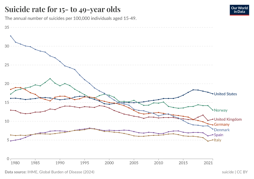 IHME, Global Burden of Disease (2024) – with minor processing by Our World in Data. “Suicide rate for 15- to 49-year olds” [dataset]. IHME, Global Burden of Disease, “Global Burden of Disease - Deaths and DALYs” [original data]. Retrieved September 5, 2025 from https://data-auxiliary-trade.owid.pages.dev/grapher/suicide-rate-for-15--to-49-year-olds