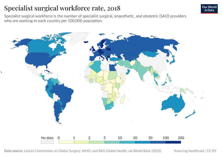 Lancet Commission on Global Surgery, WHO, and BMJ Global Health, via World Bank (2025) – processed by Our World in Data. “Specialist surgical workforce rate” [dataset]. Lancet Commission on Global Surgery, WHO, and BMJ Global Health, via World Bank, “World Development Indicators” [original data]. Retrieved September 5, 2025 from https://data-auxiliary-trade.owid.pages.dev/grapher/surgeons-per-100000