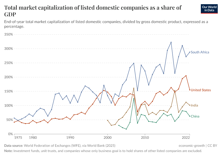“Data Page: Total market capitalization of listed domestic companies as a share of GDP”. Our World in Data (2025). Data adapted from World Federation of Exchanges, via World Bank. Retrieved from https://data-auxiliary-trade.owid.pages.dev/grapher/total-market-capitalization-listed-domestic-companies-share-gdp [online resource]How to cite this data