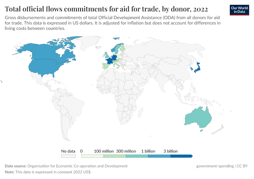 “Data Page: Total official flows commitments for aid for trade, by donor”. Our World in Data (2025). Data adapted from Organisation for Economic Co-operation and Development. Retrieved from https://data-auxiliary-trade.owid.pages.dev/grapher/total-oda-for-aid-for-trade-by-donor [online resource]How to cite this data