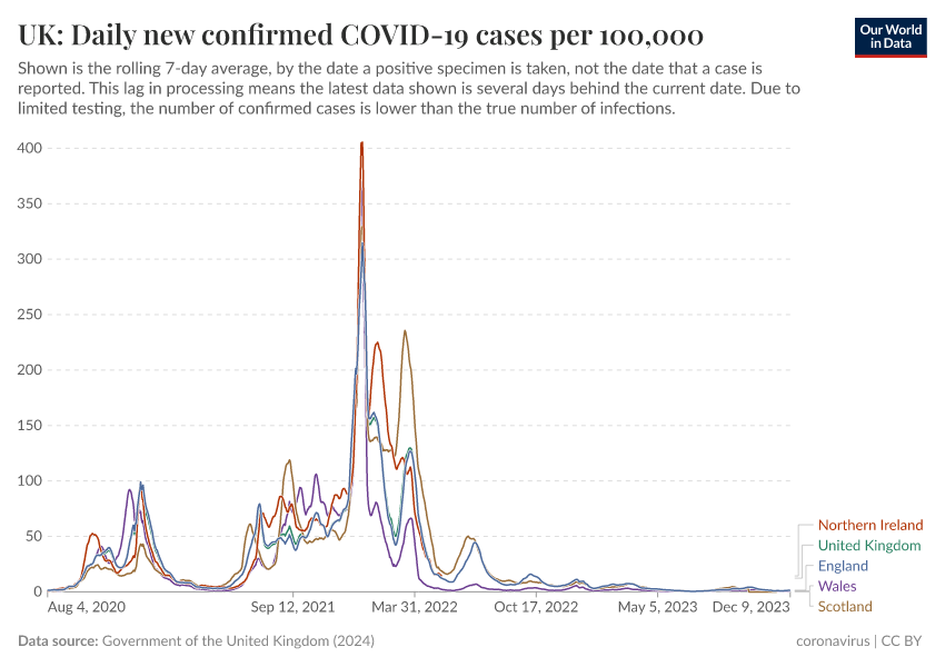 Government of the United Kingdom (2024) – with minor processing by Our World in Data. “UK: Daily new confirmed COVID-19 cases per 100,000” [dataset]. Government of the United Kingdom, “UKHSA data dashboard” [original data]. Retrieved September 5, 2025 from https://data-auxiliary-trade.owid.pages.dev/grapher/uk-daily-covid-cases-7day-average