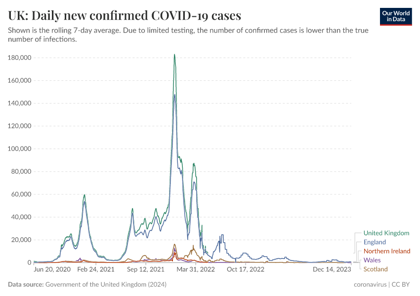 Government of the United Kingdom (2024) – with minor processing by Our World in Data. “UK: Daily new confirmed COVID-19 cases” [dataset]. Government of the United Kingdom, “UKHSA data dashboard” [original data]. Retrieved September 5, 2025 from https://data-auxiliary-trade.owid.pages.dev/grapher/uk-daily-new-covid-cases