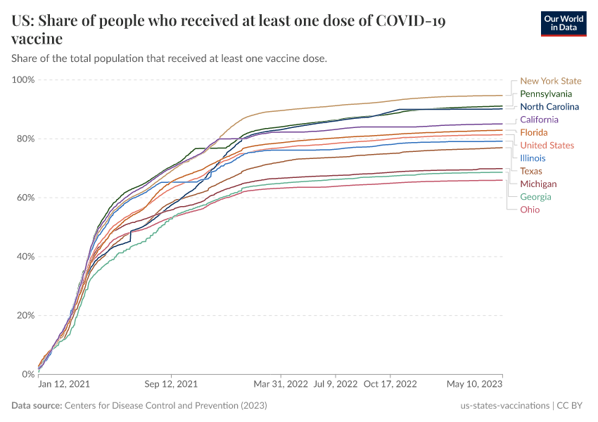 Centers for Disease Control and Prevention (2023) – processed by Our World in Data. “US: Share of people who received at least one dose of COVID-19 vaccine” [dataset]. Centers for Disease Control and Prevention, “COVID-19, Vaccinations (United States)” [original data]. Retrieved September 5, 2025 from https://data-auxiliary-trade.owid.pages.dev/grapher/us-covid-19-share-people-vaccinated
