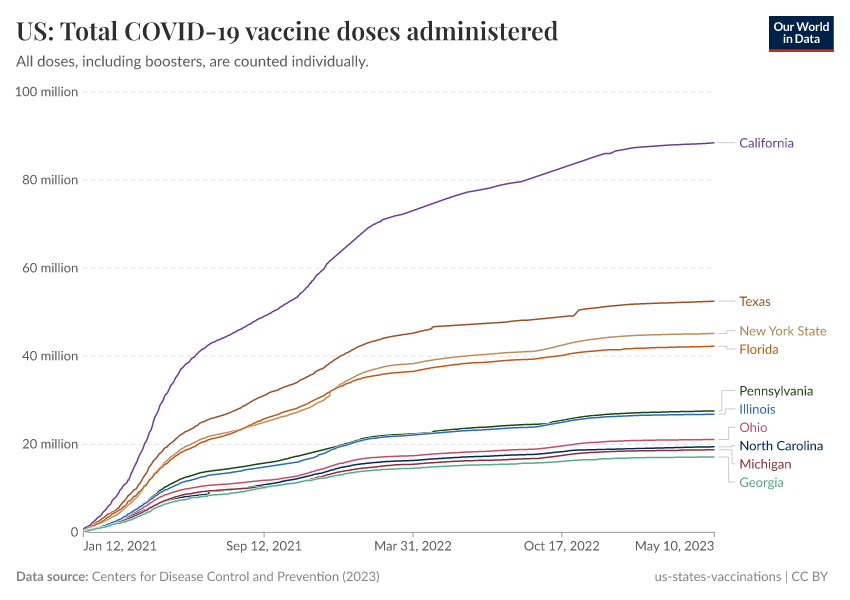 Centers for Disease Control and Prevention (2023) – processed by Our World in Data. “US: Total COVID-19 vaccine doses administered” [dataset]. Centers for Disease Control and Prevention, “COVID-19, Vaccinations (United States)” [original data]. Retrieved September 5, 2025 from https://data-auxiliary-trade.owid.pages.dev/grapher/us-total-covid-19-vaccine-doses-administered