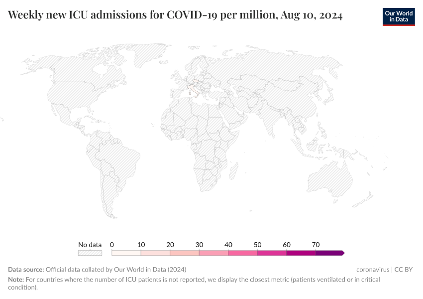 • Hospital and ICU data are sourced from official providers and collated by Our World in Data, but no new datapoints have been added since 13 August 2024.