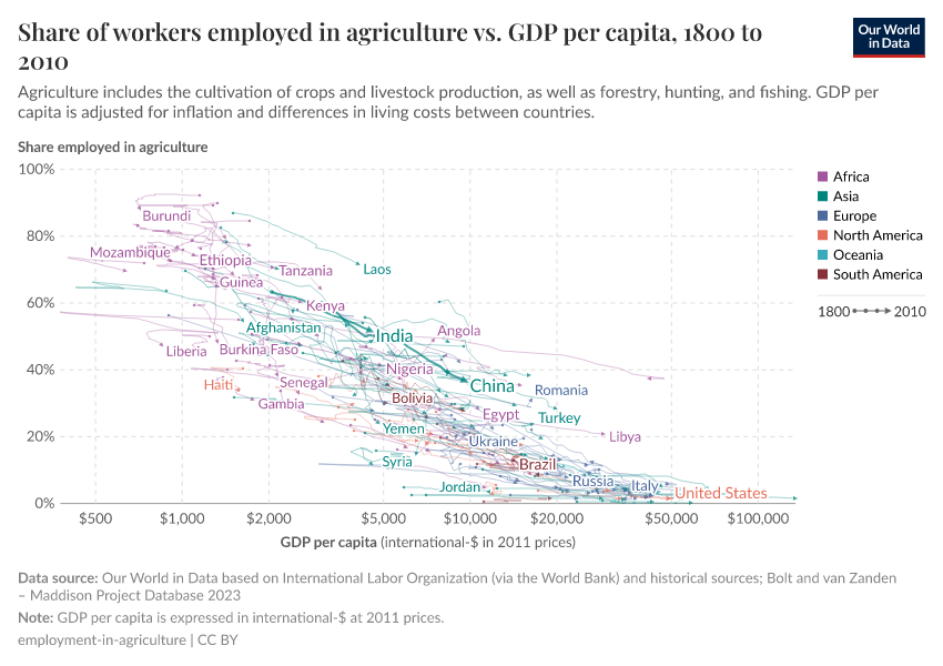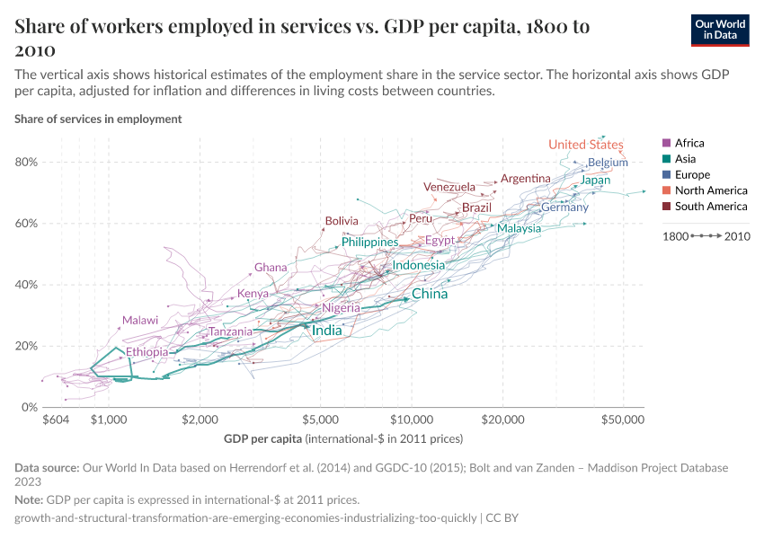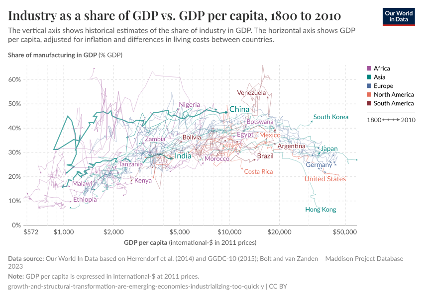 One way to study the process of ‘structural transformation’ across countries is to track how employment changes across sectors in the economy. The below chart does this, plotting the share of industry in total employment (vertical axis) against GDP per head (horizontal axis). This graph is a 'connected scatter plot' – each line shows the trajectory that a country followed over time along these two dimensions. Data is available for a selection of more than 40 countries, across all continents.