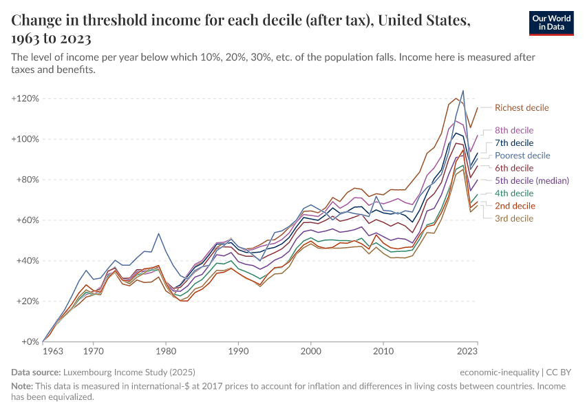 Curiously, these reductions in 'happiness inequality' have taken place alongside growing income inequality. As the following chart shows, income inequality in the US is exceptionally high and has been on the rise in the last four decades, with incomes for the median household growing much more slowly than incomes for the top 10%.