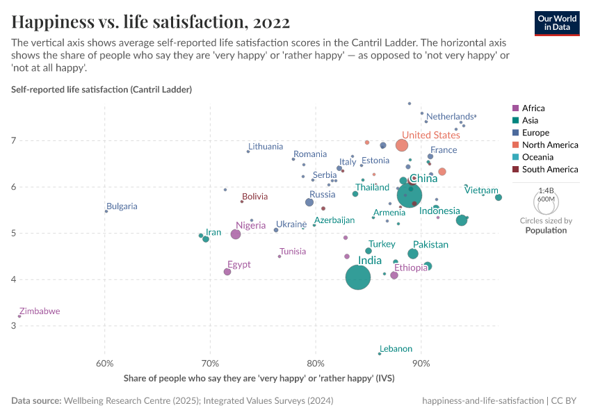 In this topic page, we discuss data and empirical research on happiness and life satisfaction. However, it is important to bear in mind that “life satisfaction” and “happiness” are not really synonyms. This is, of course, reflected in the data since self-reported measures of these two variables come from asking different kinds of questions.