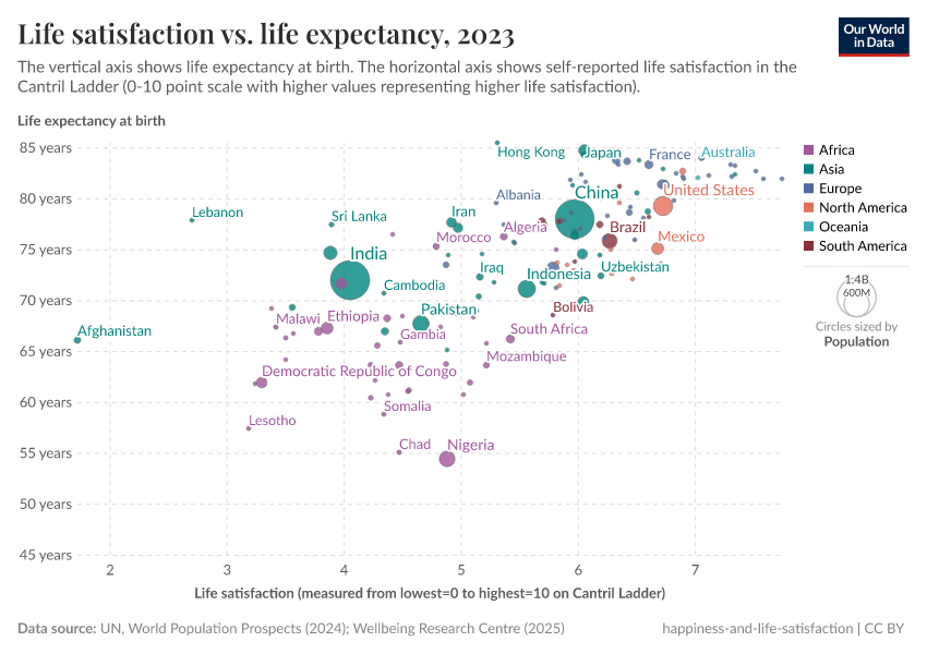 Each dot in the scatterplot represents one country. The vertical position of the dots shows national life expectancy at birth, and the horizontal position shows the national average self-reported life satisfaction in the Cantril Ladder (a scale ranging from 0-10, where 10 is the highest possible life satisfaction).
