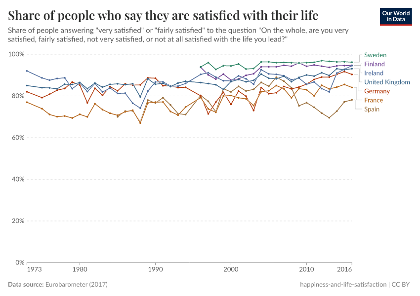 The Eurobarometer survey collects data on life satisfaction as part of their public opinion surveys. For several countries, these surveys have been conducted at least annually for more than 40 years. The visualization here shows the share of people who report being ‘very satisfied’ or ‘fairly satisfied’ with their standards of living.