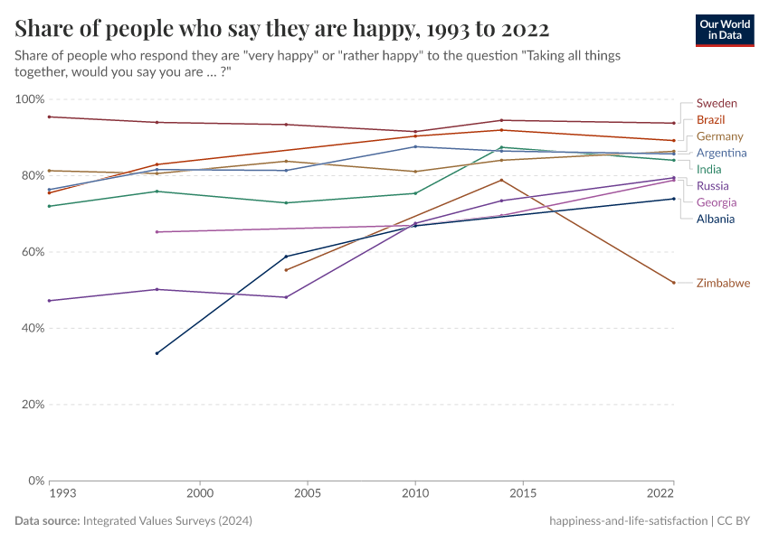 The Integrated Values Surveys collect data from a series of representative national surveys covering almost 100 countries, with the earliest estimates dating back to 1981. In these surveys, respondents are asked: “Taking all things together, would you say you are (i) Very happy, (ii) Rather happy, (iii) Not very happy, or (iv) Not at all happy”. This visualization plots the share of people answering they are “very happy” or “rather happy”.