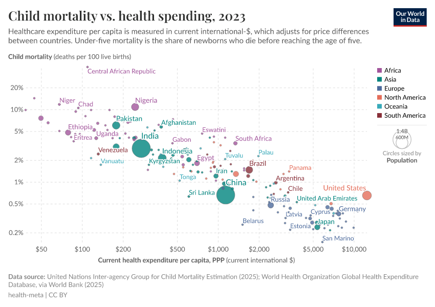 The chart below shows how healthcare spending is related to child mortality, in the same format.