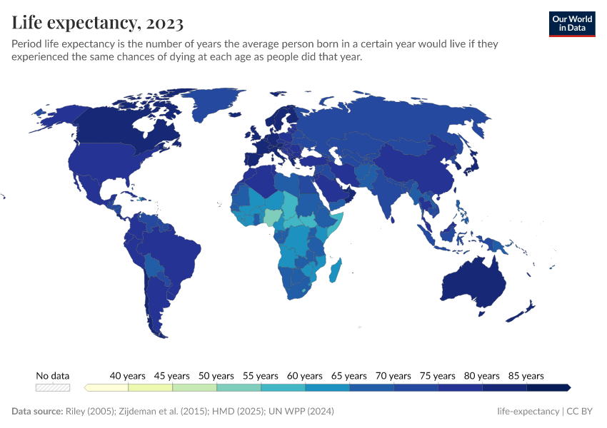 The map view shows a comparison of life expectancy across countries. As you can see, although the global disparity in life expectancy has reduced substantially, there are still huge differences between countries.