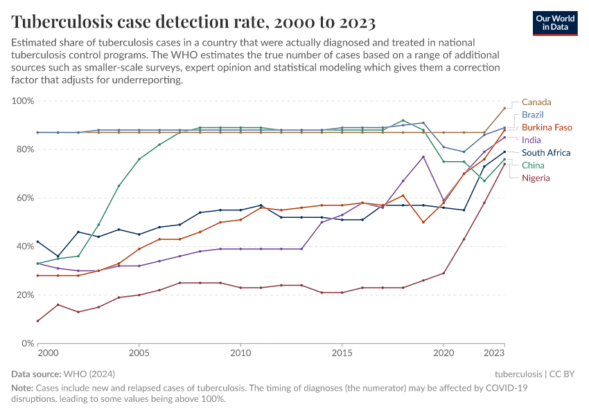In the chart below, you can see rises in detection rates for tuberculosis in different countries. This is again helped by efforts such as The Global Fund and PEPFAR.