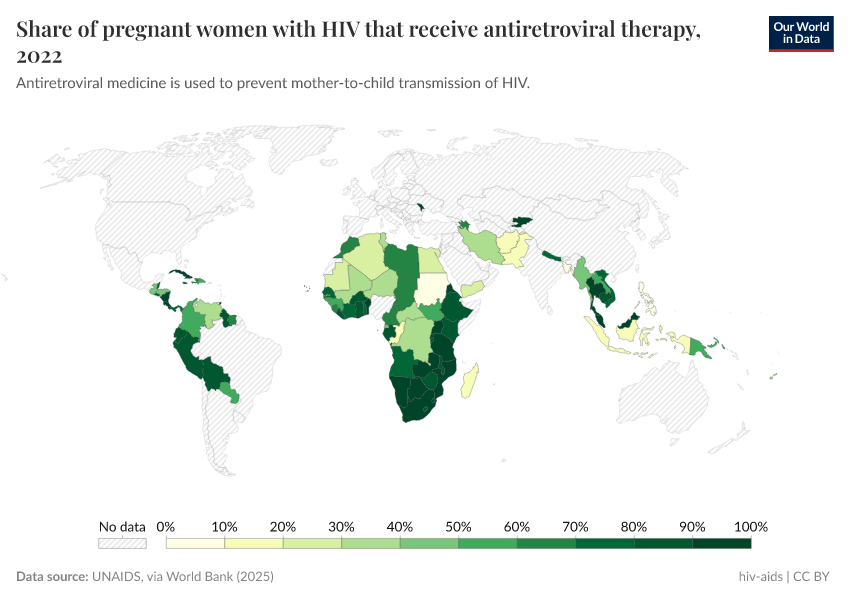 This map shows the share of pregnant women infected with HIV who receive antiretroviral therapy – a vital intervention to prevent the transmission from mother to child.