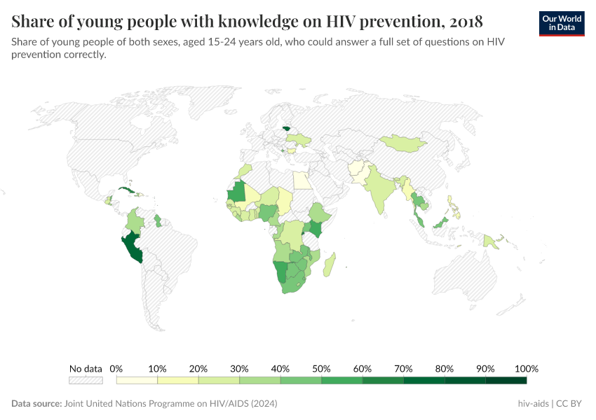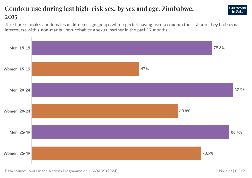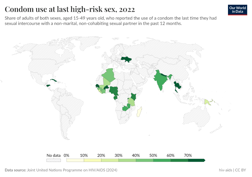 Sexual transmission can be prevented through condom use (both in heterosexual and homosexual relationships). In the charts here, we see the prevalence of condom use, particularly in cases of “high-risk sex”, which is defined by this data’s source as non-marital, non-cohabiting sexual partner.