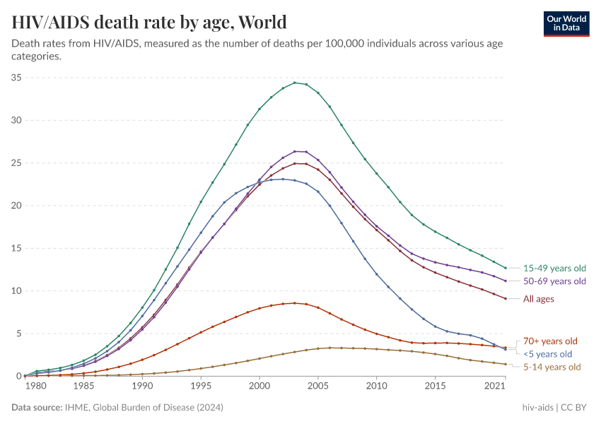 In the chart, we show death rates by age group. Here we see that the most at-risk group is younger adults (15 to 49-year-olds). Since HIV is primarily a sexually transmitted infection, where unsafe sex is a primary risk factor, this is what we would expect.