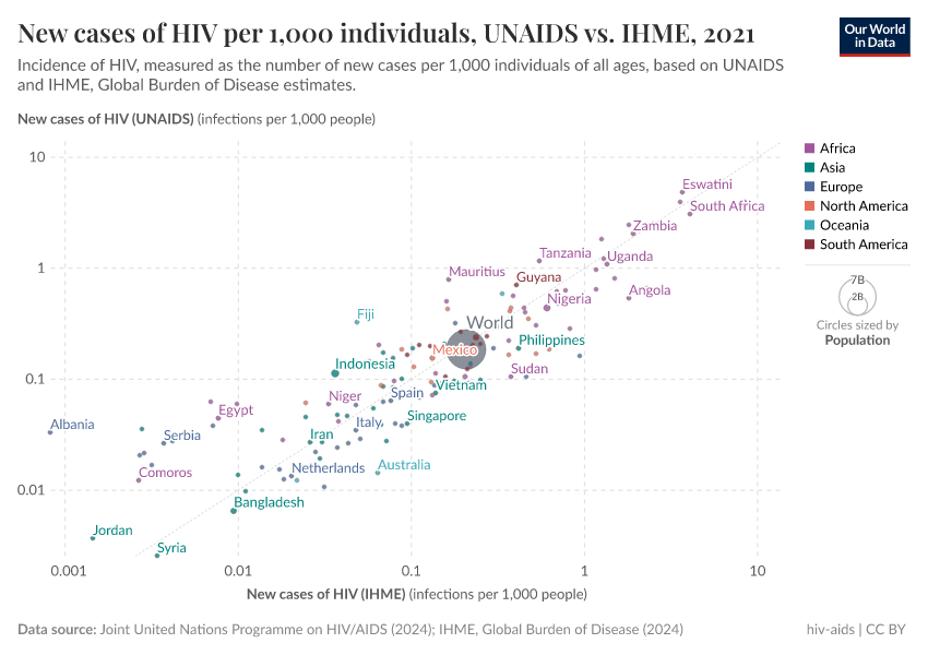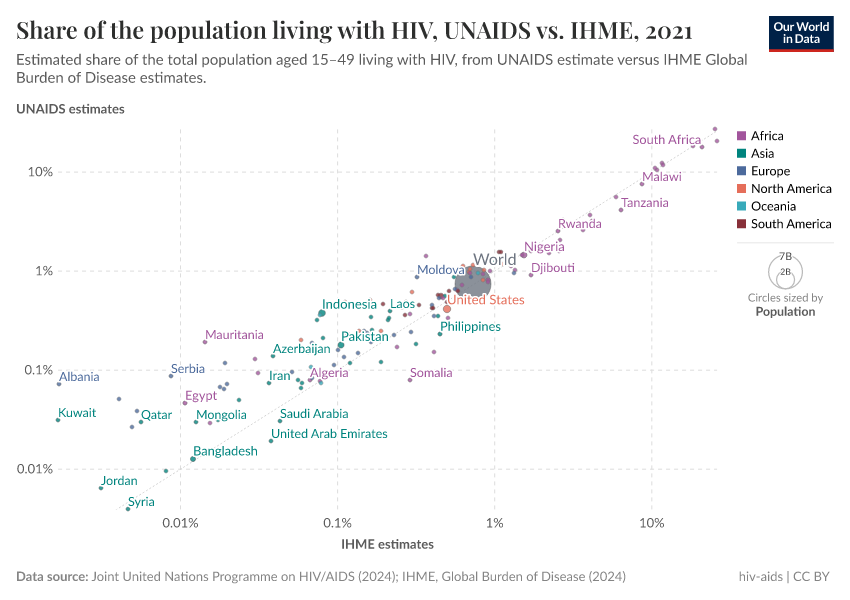 Several sources publish estimates on HIV and AIDS. Two of the most established sources, presented on this page, are UNAIDS and the Institute of Health Metrics and Evaluation (IHME). The charts below show a comparison of these two sources' estimates.