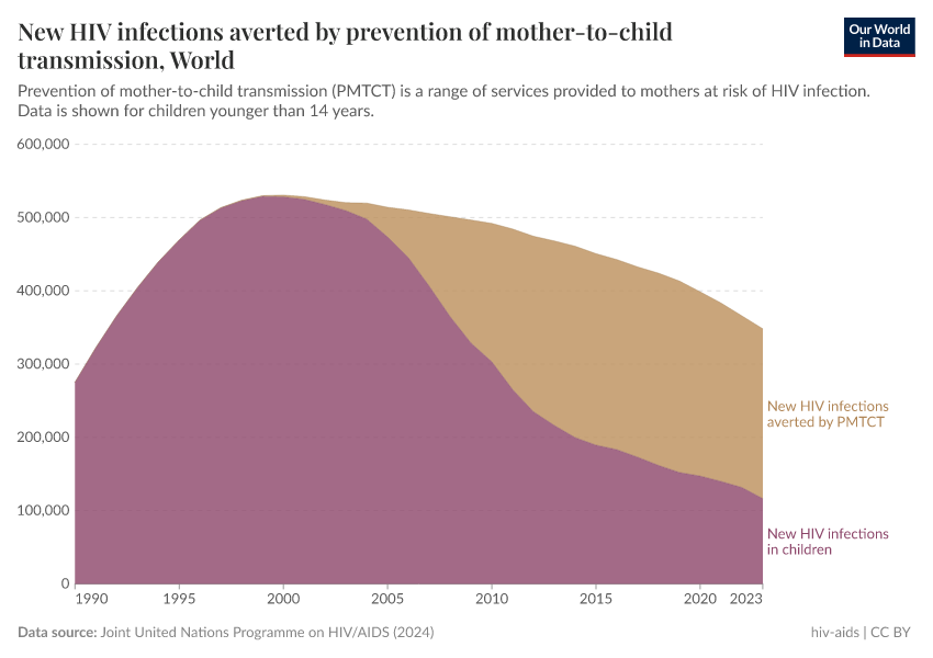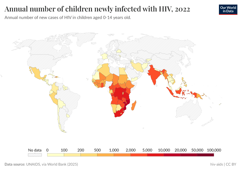 The map shows the total number of children newly infected with HIV yearly. Globally — with similar trends at national levels — the number of new infections in children peaked around the early 2000s (with over 500,000 new infections per year globally), followed by a rapid decline over the last decade.