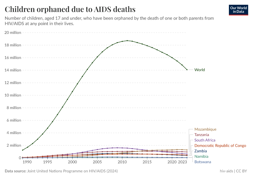 Some children have lost either one or both parents to AIDS. This does not necessarily imply that children orphaned by AIDS have HIV themselves (although, in some cases, HIV has been transmitted from mother to child). The chart shows the number of children (aged 17 and under) orphaned from AIDS deaths.