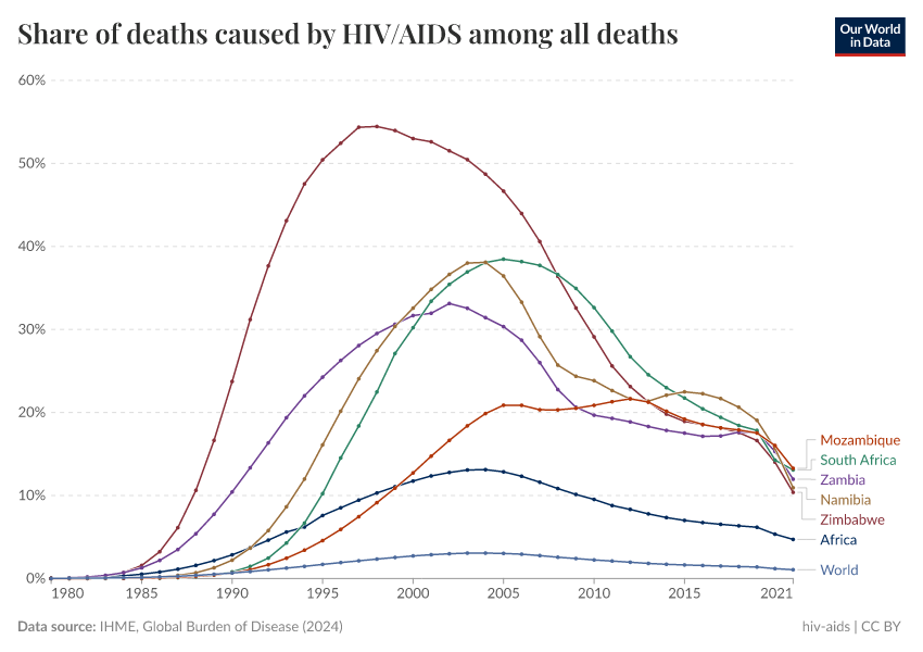 In the visualization, we see the change in the share of deaths from HIV/AIDS over time. From the 1990s through to the early 2000s, it was the cause of more than 1 in 3 deaths in several countries and even more than half of annual deaths in the late 1990s in Zimbabwe.