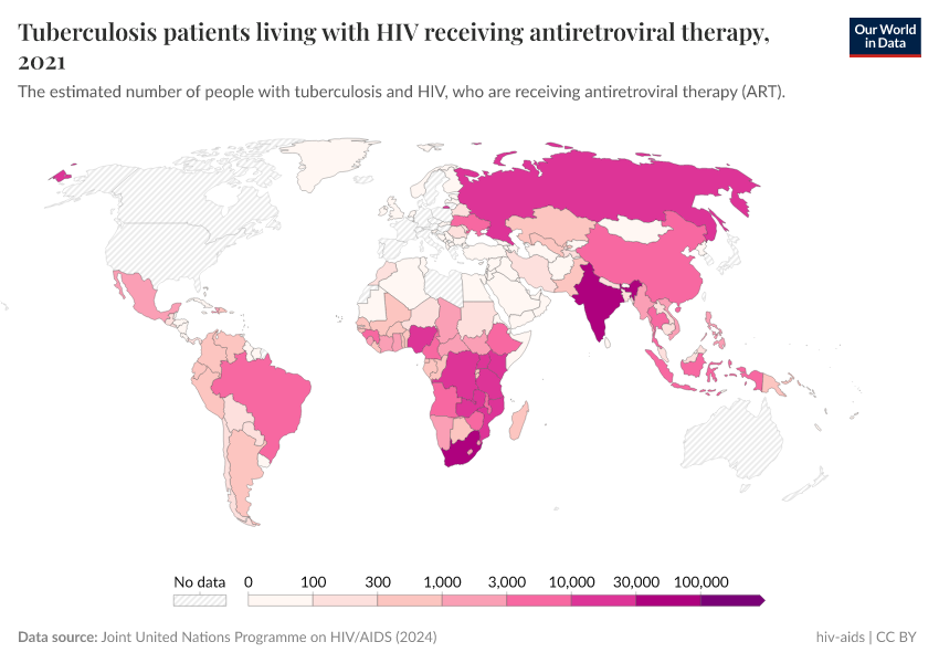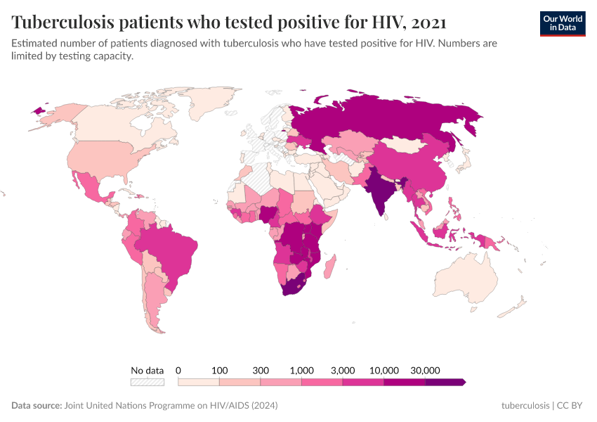 Tuberculosis (TB) is the leading HIV-associated opportunistic infection in low- and middle-income countries, and it is a leading cause of death globally among people living with HIV. Death due to tuberculosis remains high among people living with HIV. However, the number of deaths is decreasing. Most of the global mortality due to TB among those with HIV is from cases in Sub-Saharan Africa.