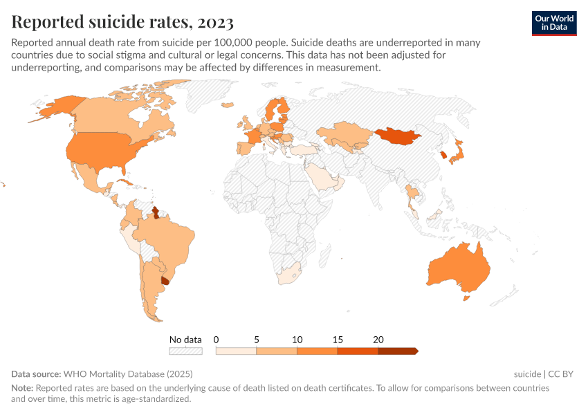 The map below shows the reported suicide rate in each country in the WHO Mortality Database (WHO MDB). It republishes reported data from all countries that have registered at least 65% of all deaths with a cause of death.