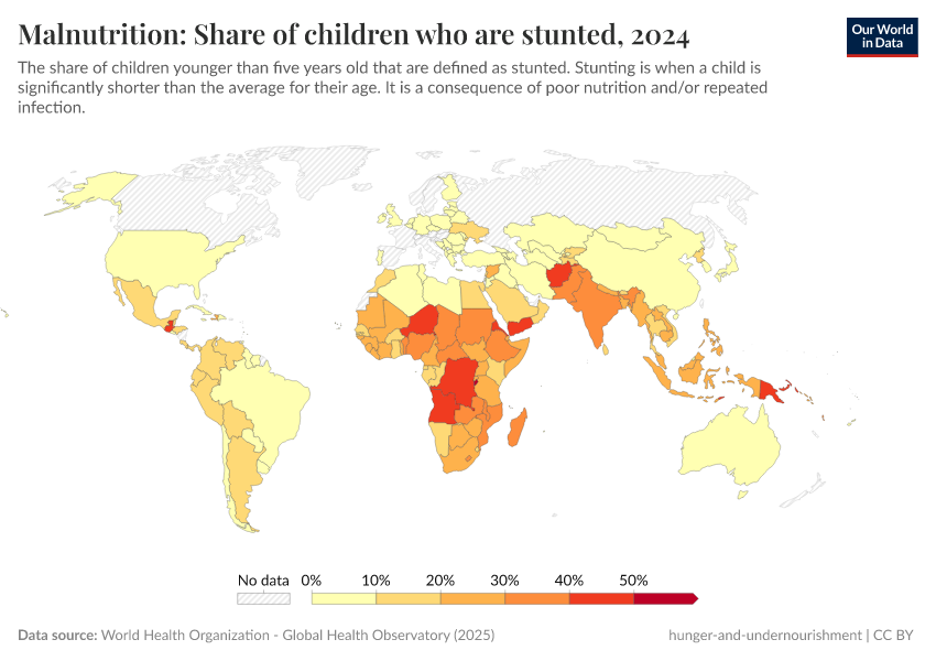 The fight against hunger focuses on a sufficient energy intake – enough calories per person per day. But it is not the only factor that matters for a healthy diet. Sufficient protein, fats, and micronutrients are also essential, and we cover this in our topic page on micronutrient deficiencies.
