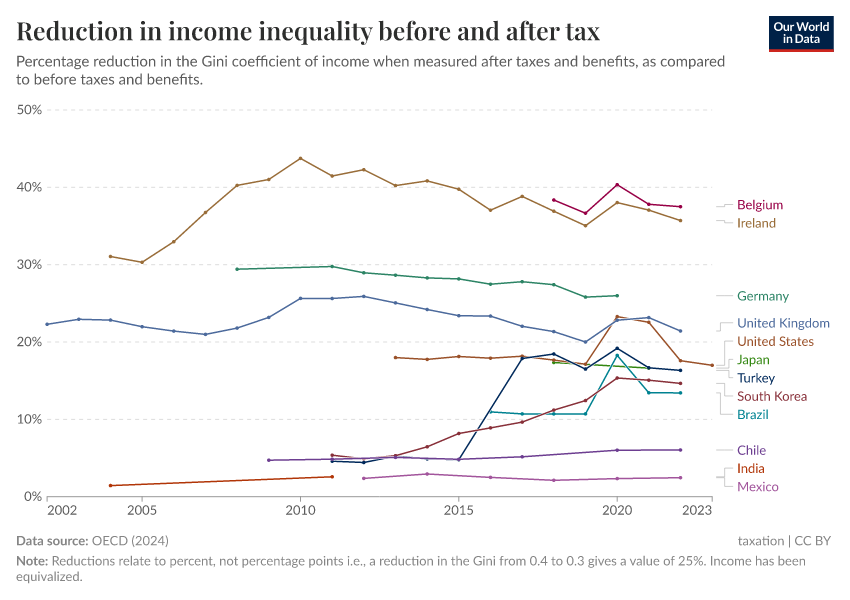 This chart shows another view on the same data, plotting the percentage reduction in the Gini coefficient that countries achieve through redistribution.4