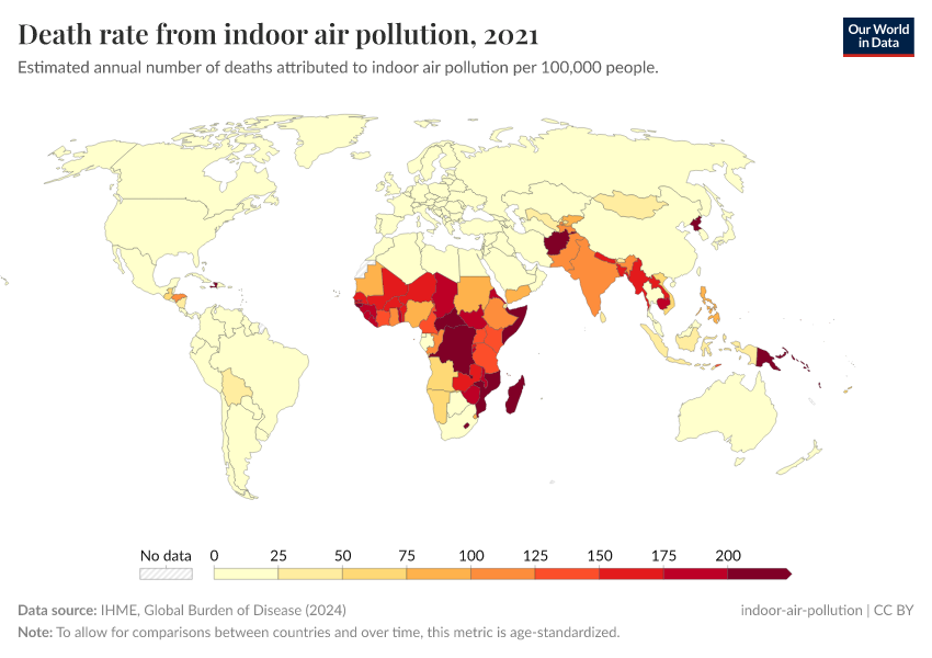 This is based on the share of deaths that are attributable to indoor air pollution based on the impact of air pollution on the risk of diseases like cardiovascular disease, lung disease, lung cancer, and others. In other words, it is an estimate of the share of all deaths that would be prevented if indoor air pollution was absent.
