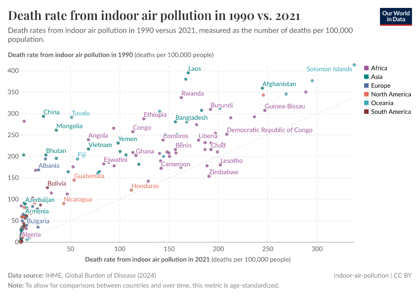 In the scatterplot here we see the comparison between the death rate from indoor air pollution in 1990 (shown on the y-axis) versus the death rate in the latest year (on the x-axis). The grey line here marks where the death rate would be equal in both years; countries that lie above the line had a higher death rate in 1990, and the opposite is true for countries below the line.
