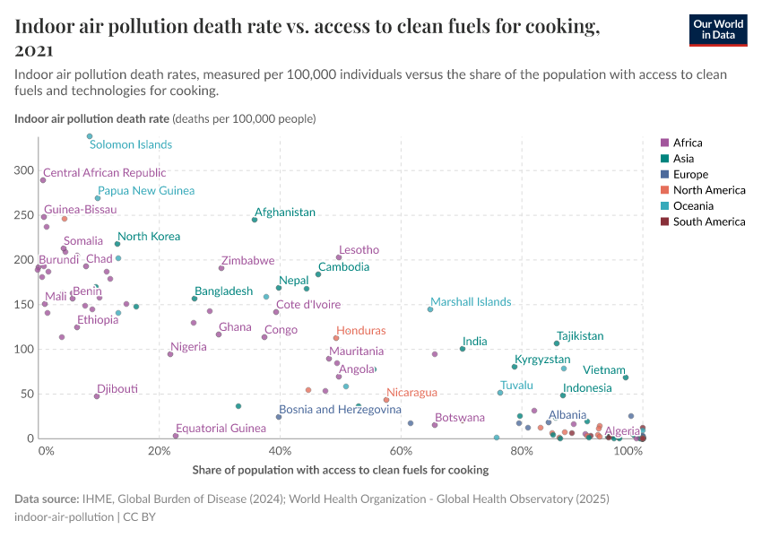Low-income households tend to rely on solid fuels for cooking because cleaner fuels are either unavailable or too expensive. We, therefore, see a strong link between death rates from indoor air pollution and access to clean fuels for cooking.