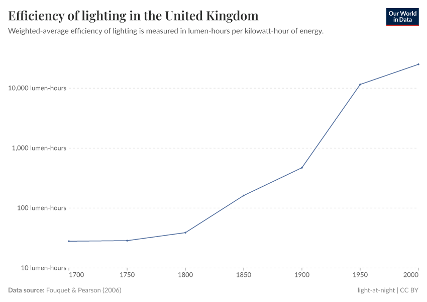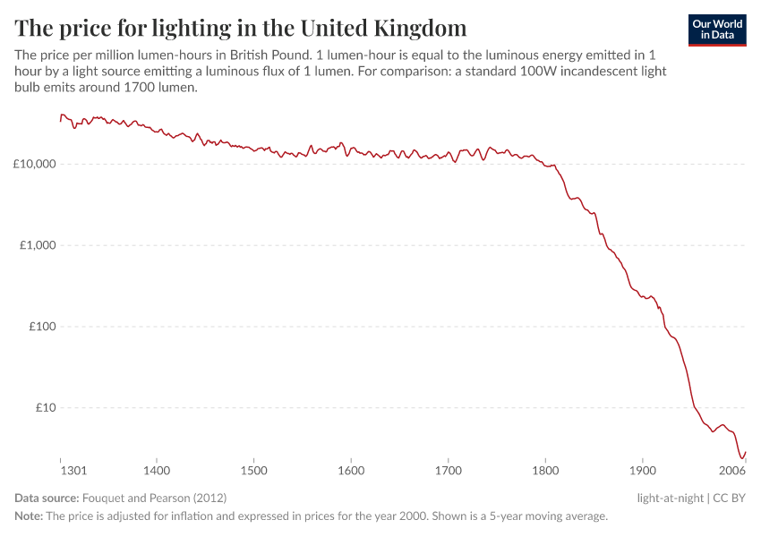 The price of light has fallen by more than 99.9% since 1700. And its efficiency has increased 1000-fold. This has made light at night available to more and more people.