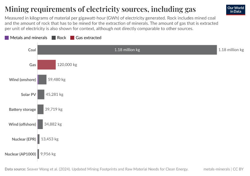 When we examine the minerals and materials for coal, renewables, and nuclear, we’re mostly comparing the amount of rock that has to be mined. Natural gas is, of course, a gas rather than a solid, which makes direct comparison a bit less relevant.