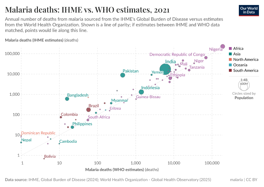 These estimates are notably higher than those of the WHO. Although divergent on the total number of malaria deaths, both the IHME and WHO estimate that the vast majority of deaths are in the African region.