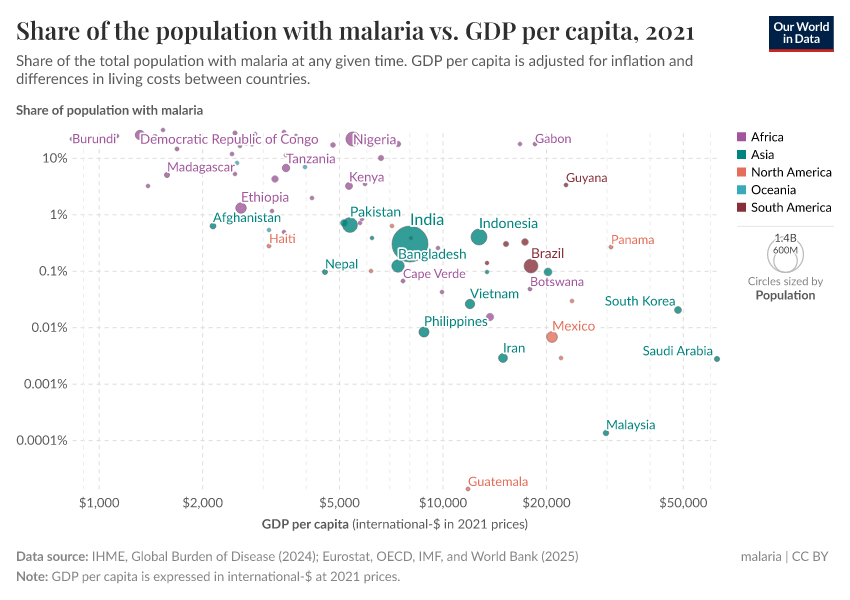 In the chart below, you can see each country’s prevalence of malaria compared to their GDP per capita.