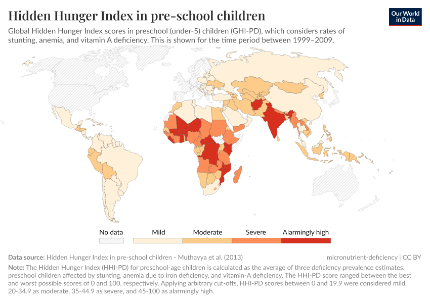 One metric that has been developed to indicate the severity of this is the Global Hidden Hunger Index (GHHI). Note that the terms "hidden hunger" and "micronutrient deficiency" are often used interchangeably. The GHHI is most commonly used to assess the nutritional status of preschool children (under the age of five).