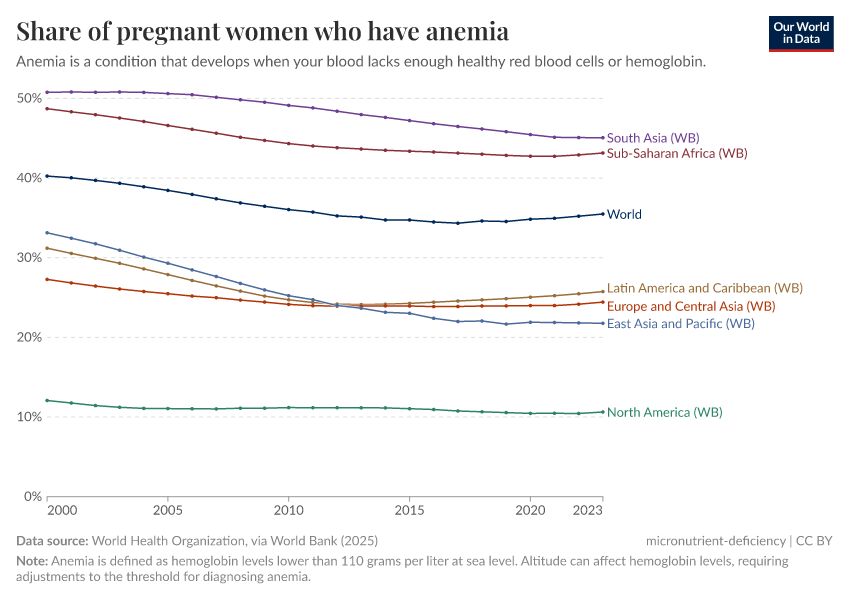 In the chart, we see the prevalence of anemia in pregnant women. Globally, around a third of pregnant women worldwide are anemic.